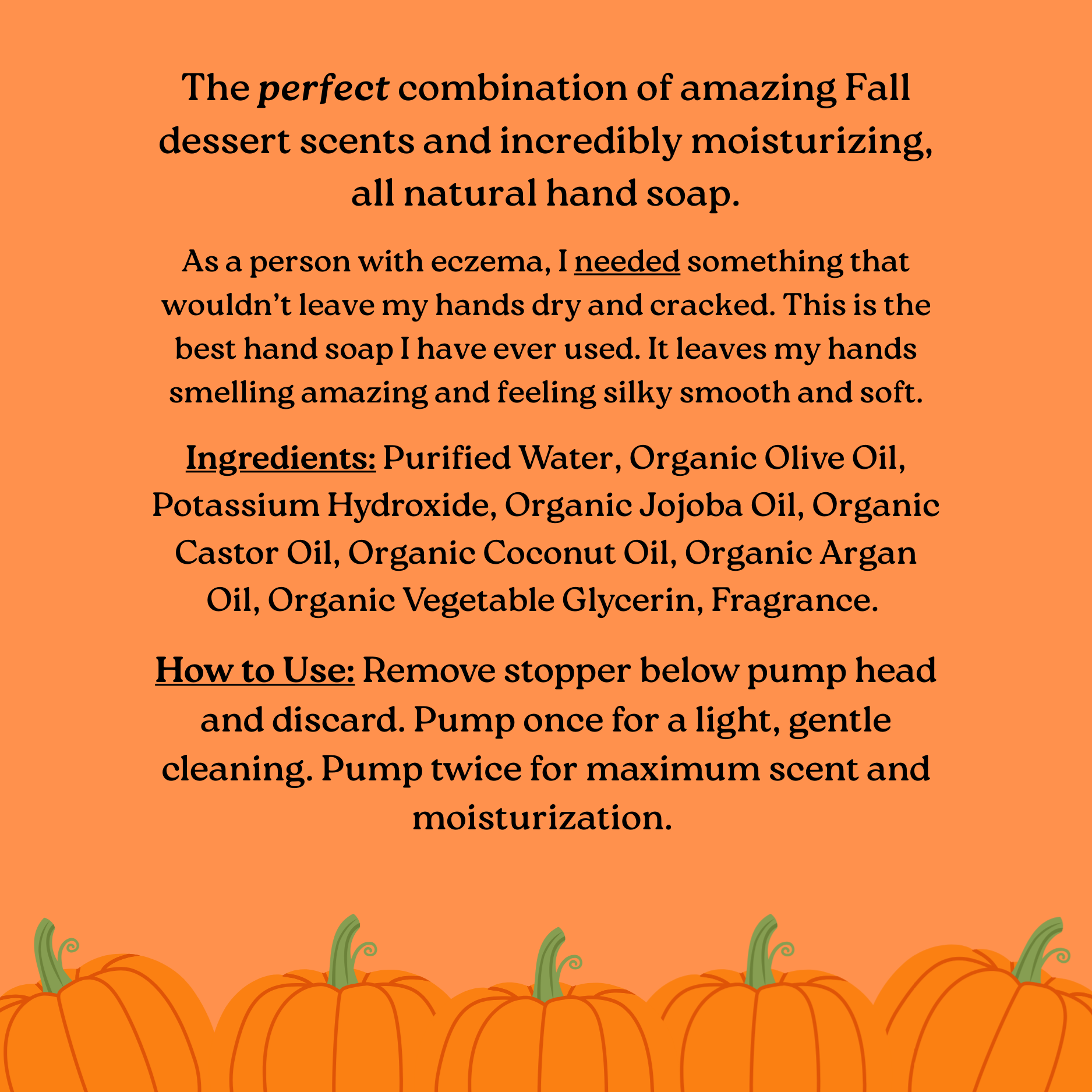 Our Pumpkin Pie Foaming Hand Soap is loaded to the brim with ultra moisturizing Organic Oils and tons of delectable Pumpkin Pie scent. Unlike most scented hand soaps, ours will leave your hands feeling silky smooth and smelling absolutely amazing!